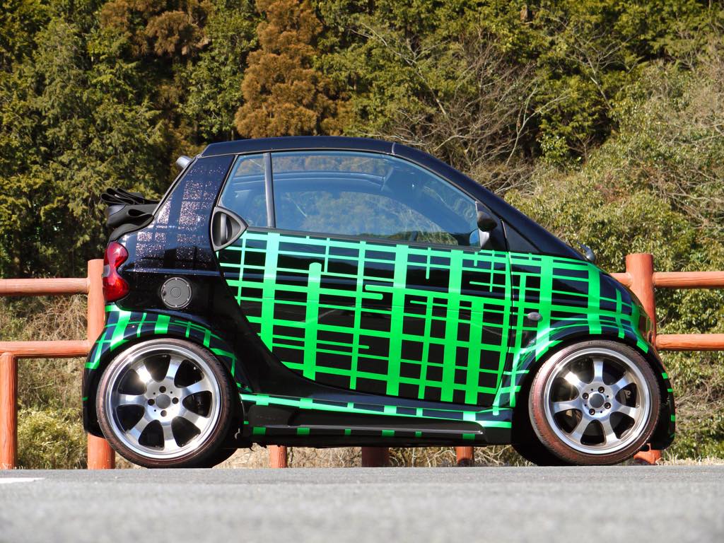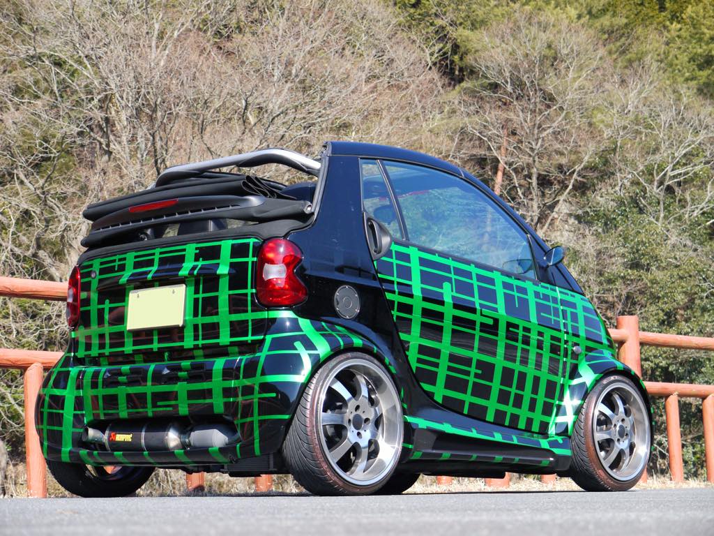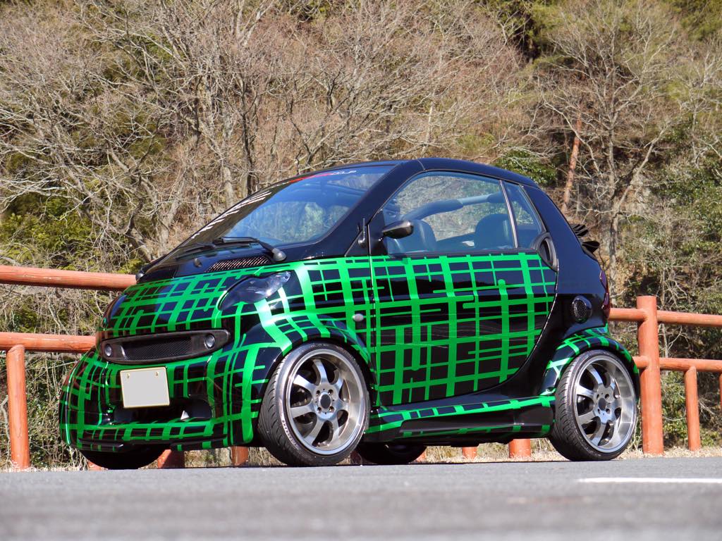 | 車両製作コンセプト | スマートの斬新なデザインを更にオシャレにトータルコーディネート。インテリアでは、ダッシュボードの製作から、張替え、オーディオのインストール。エクステリアでは、ワイドボディーキット装着、鍛造ホイール、カスタムペイント。 |